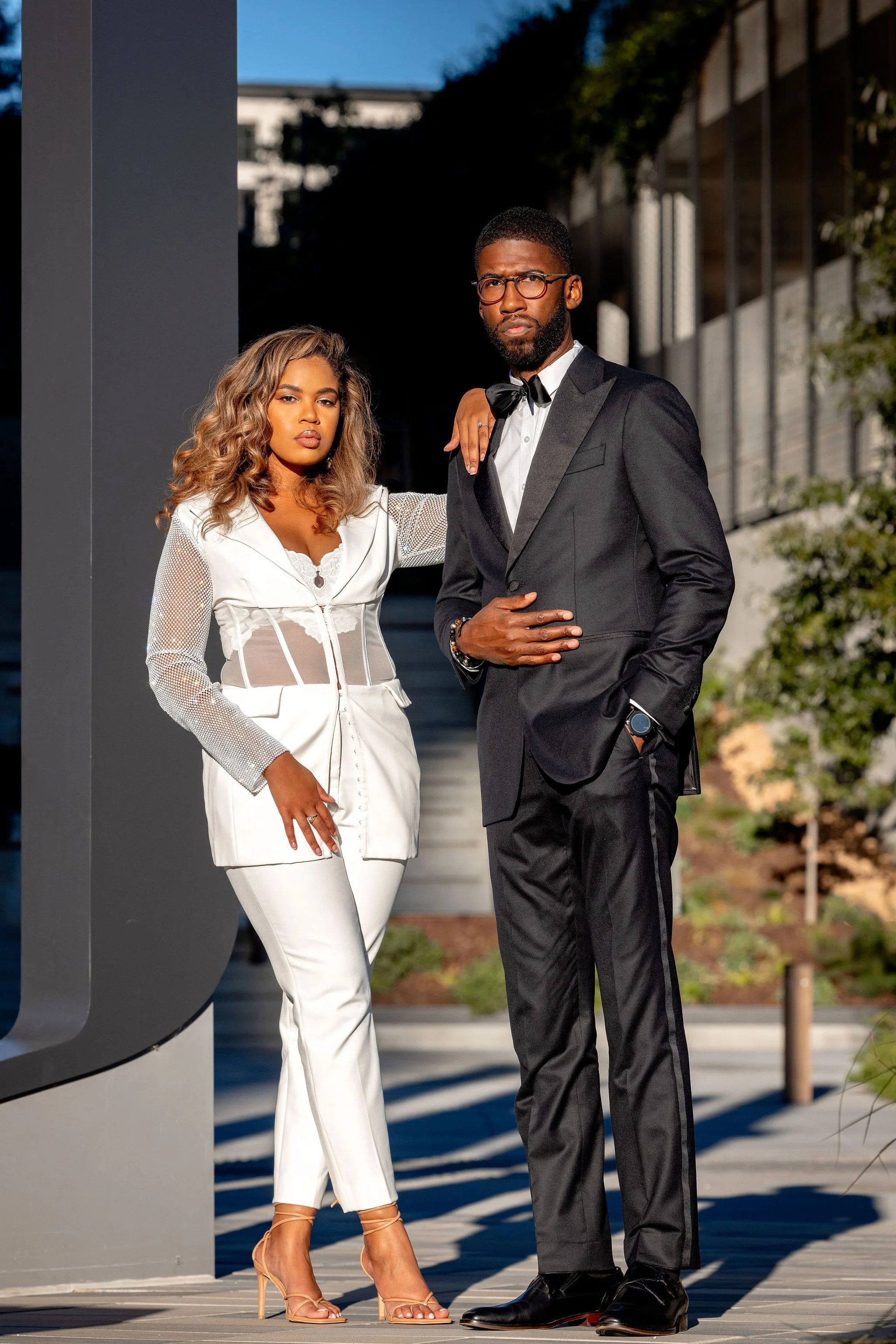 A man and woman dressed formally, standing outdoors in front of a modern building. The woman is wearing a white pantsuit with sheer sleeves and heels, while the man is in a black tuxedo with a bow tie and glasses. They are posing confidently, with th
