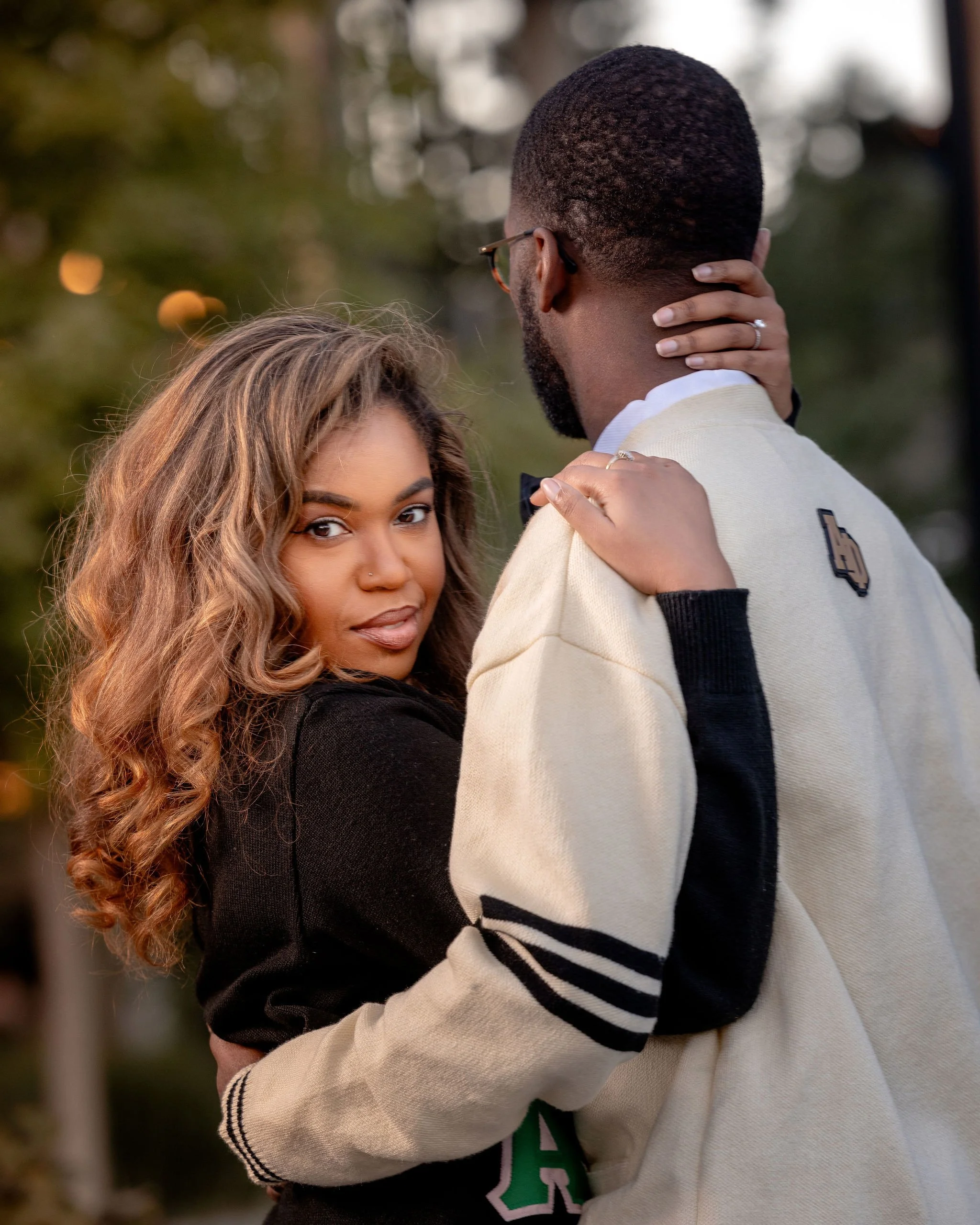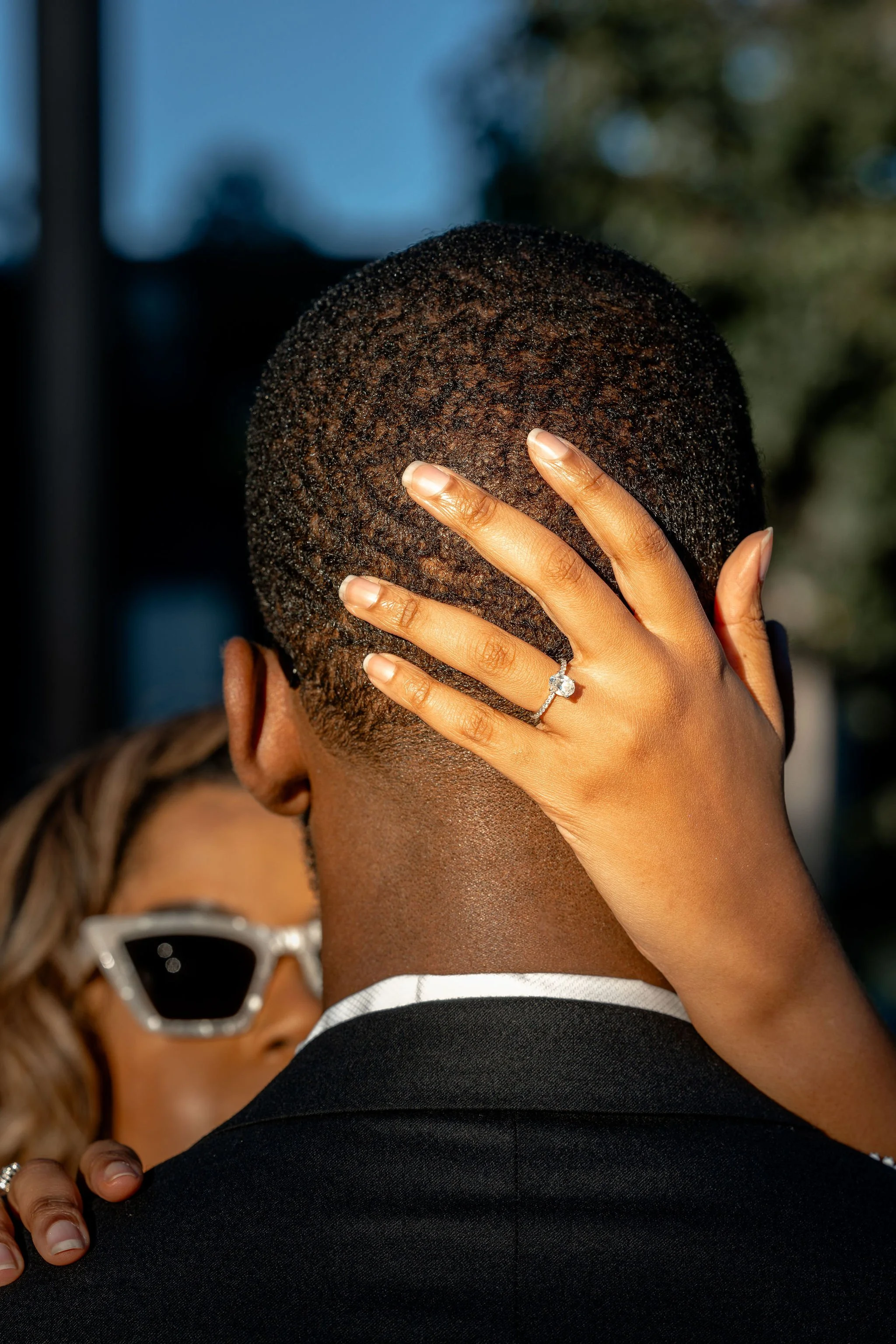 Close-up of a woman with curly hair wearing sunglasses, embracing a man with short curly hair, wearing a black suit and white shirt. The woman has an engagement ring on her finger.
