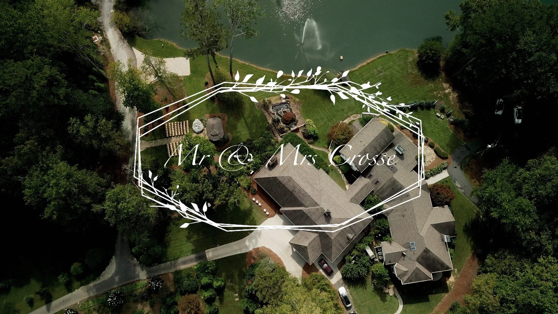 Aerial view of a large house with a pond, trees, and a lawn, overlaid with white decorative text reading "Mr & Mrs Crossie" surrounded by a leafy border.
