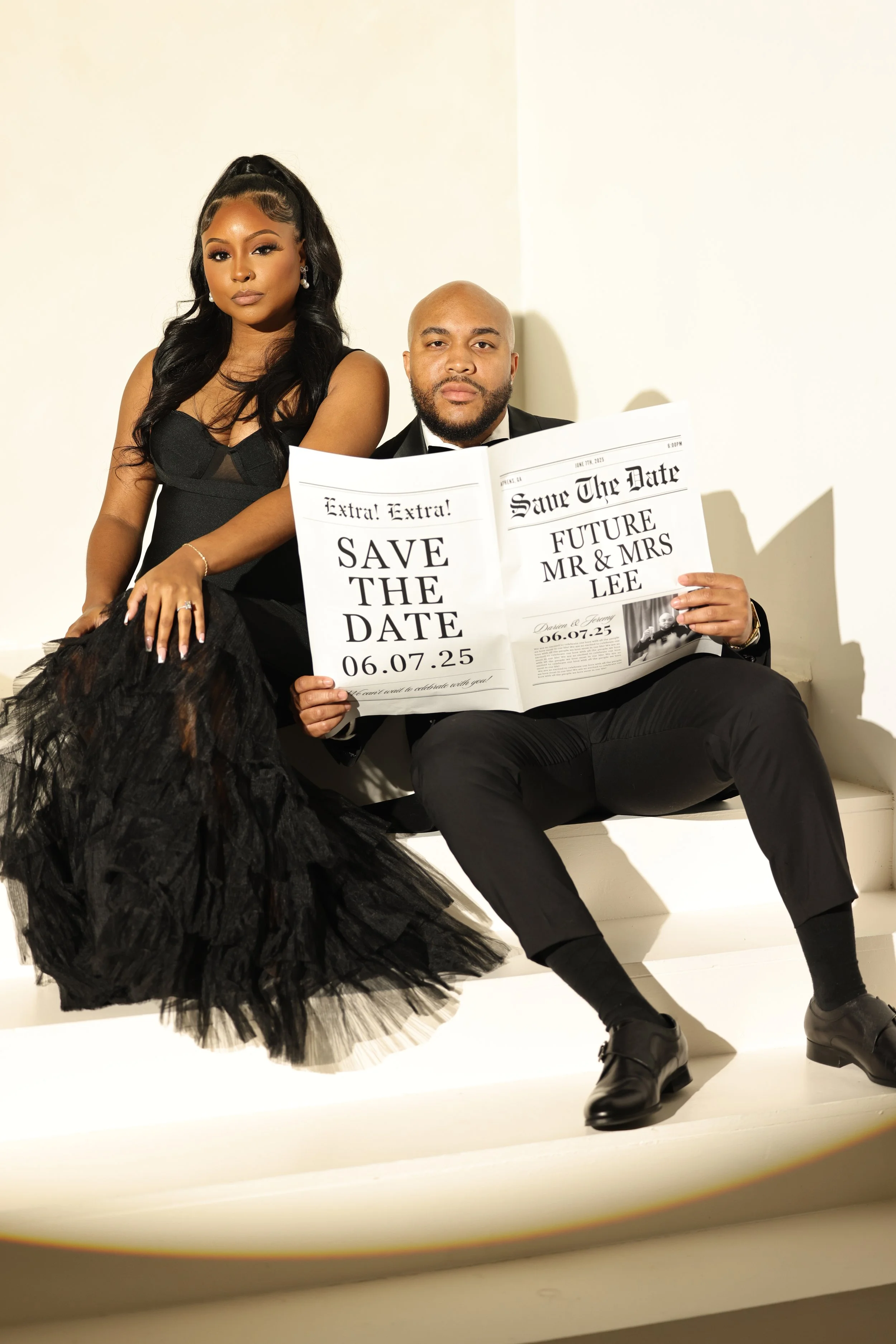 A couple in formal black attire sitting on a white bench, with the man holding a newspaper announcing their wedding date for June 7, 2025.