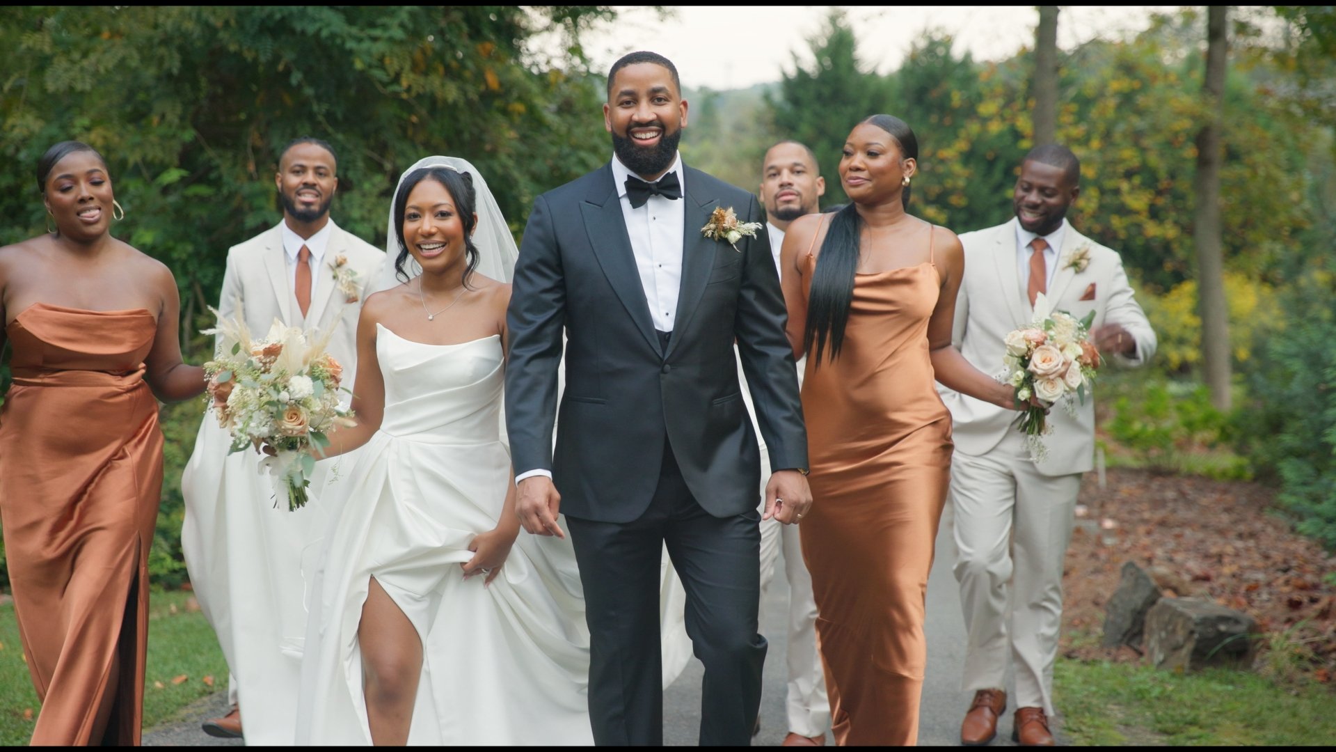 A joyful wedding party walking outdoors, featuring a groom in a black tuxedo and a bride in a white wedding dress leading the group amid trees and greenery.